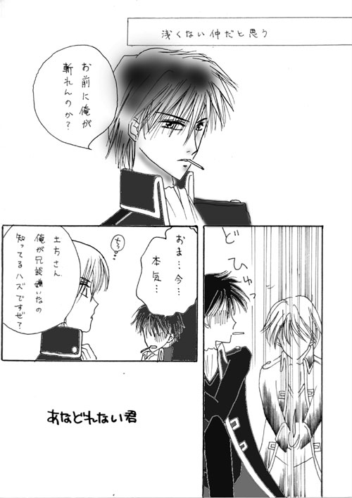 あなどれない君 NEXT 全6ページの短いものです。 イベント参加しようと意気込んで一番最初に描いた土沖です。 資料もないのにイメージだけで無理矢理描いた(笑) 本作るの断念しました・・・(涙)お金と時間の関係で(うわあん!) 戻る